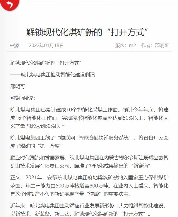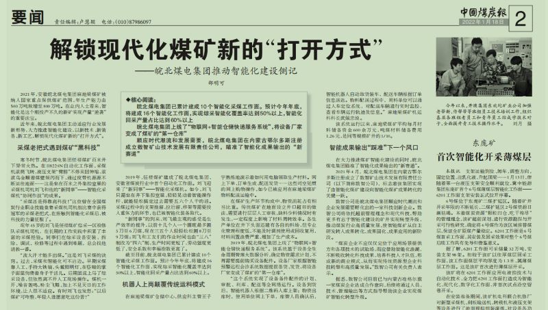 1月18日中国煤炭报2版头条:解锁现代化煤矿新的“打开方式”