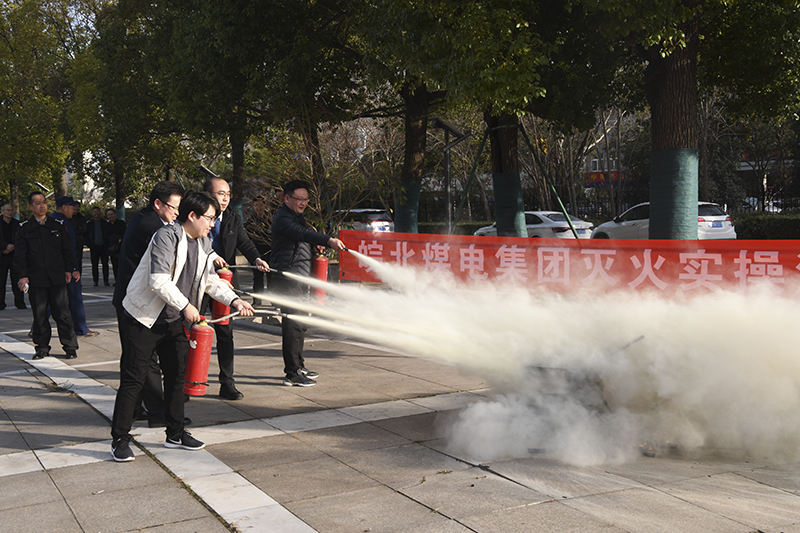 武保部工作人员现场教授职工们灭火器使用,职工们提、拔、握、压一气呵成、动作规范。