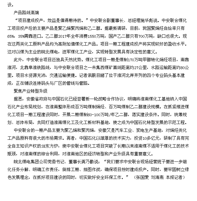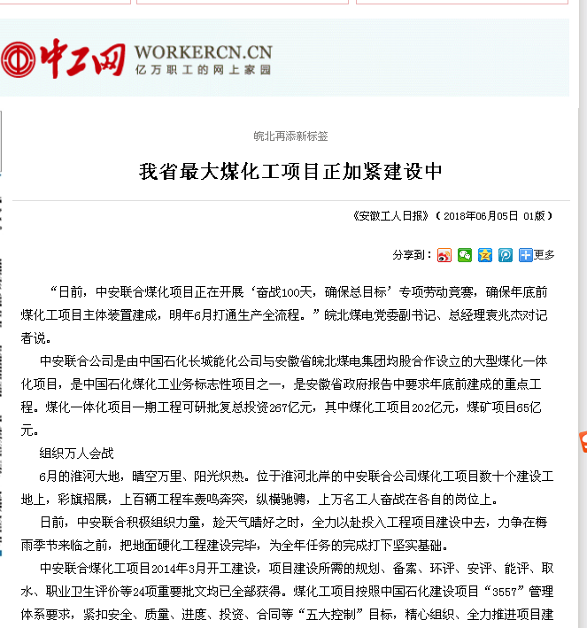 6月5日安徽工人日报头版头条:我省最大煤化工项目正加紧建设中